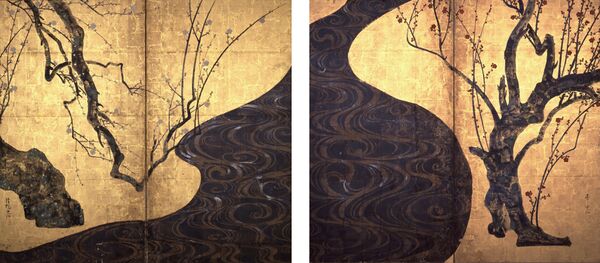 Цветение красной и белой сливы (яп. 紙本金地著色紅白梅図) — двустворчатая ширма, созданная Огатой в поздний период его творчества[11][16], считающая венцом его творчества[26][27]. На ней изображены река и две японские сливы — с белыми и красными цветами по её берегам [28].