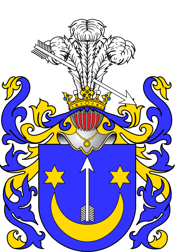 Щит увенчан дворянскими шлемом и короной. Нашлемник: три страусовых пера, пронзённых стрелой влево. Намёт на щите голубой, подложенный золотом.