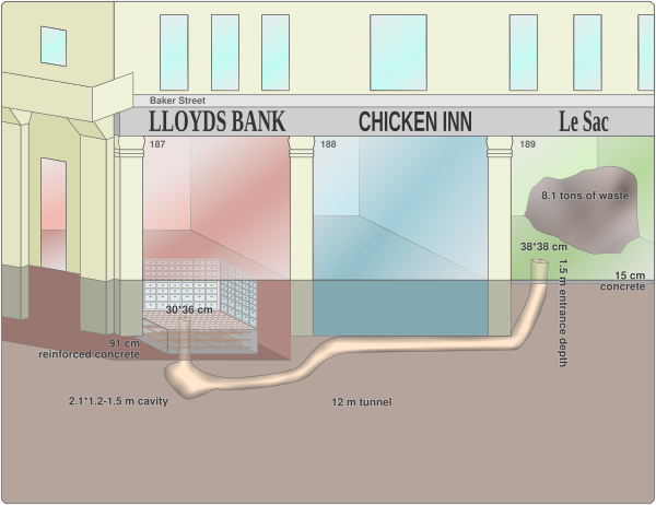 Арендовав помещение пустующего магазина кожгалантереи Le Sac, расположенного рядом с банком, грабители в течение нескольких выходных вырыли 15-метровый тоннель. Они пытались вскрыть сейф резаком, однако в итоге использовали взрывчатку. Преступники унесли примерно 1,5 миллиона фунтов наличными и драгоценности на такую же сумму.