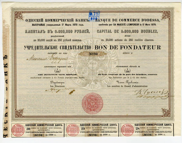 Учредители Банка суть: генерал-адъютант граф Строганов, генерал-адъютант князь Семён Воронцов, свиты Его величества контр-адмирал Николай Чихачев,... потомственный почетный гражданин Иван Мавро, статский советник Григорий Маразли (городской голова Одессы в 1878-1906 гг.)... коммерции советники Леон Эфрусси, Александр Новиков[4]