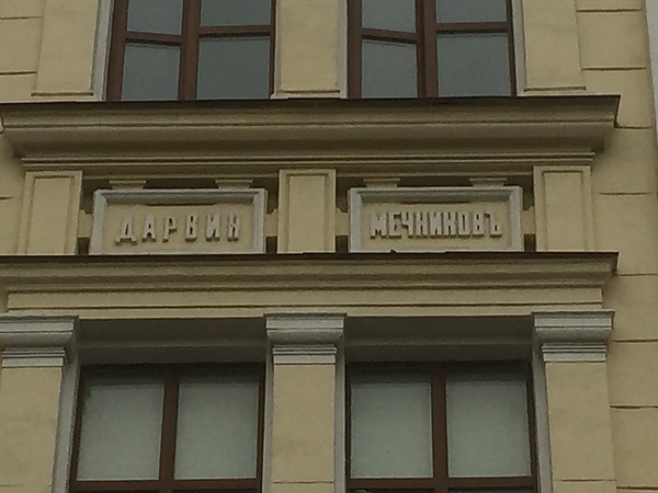 На верхнем ярусе фасада здания главного корпуса расположены таблички с фамилиями великих учёных, в основном медиков. Помимо Гиппократа, с именем указан только Клод Бернар. Фамилии четверых учёных (Ухтомский, Веденский, Ковалевский и Мечников) указаны в дореформенной орфографии.