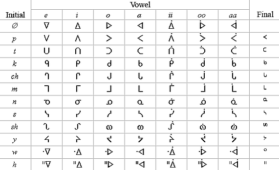 В этой системе используются следующие латинские буквы и буквосочетания: Aa, Aa aa, Bb, Ch ch, Dd, Ee, Gg, ’, Hh, Ii, Ii ii, Jj, Kk, Mm, Nn, Ny ny, Oo, Oo oo, Pp, Ss, Sh sh, Tt, Ww, Yy, Zz, Zh zh.