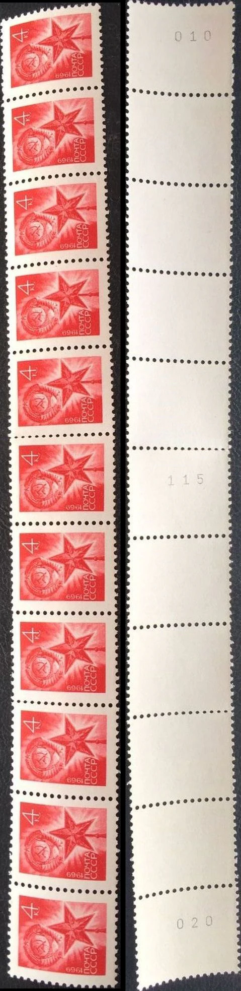 В ноябре 1969 года тиражом в 4 млн экземпляров была выпущена марка (ЦФА [АО «Марка»] № 3825) номиналом в 4 копейки, которую иногда также относят к одиннадцатому выпуску стандартных марок СССР[4]. На ней художник Е. Анискин изобразил кремлёвскую звезду на фоне Государственного герба СССР. Миниатюра предназначалась для почтовых автоматов. Она печаталась способом глубокой печати, рулонами по 1000 штук. На клеевой стороне каждой пятой марки чёрной краской наносились порядковые контрольные номера[2][5]. Кроме обычных горизонтальных сцепок, марки (ЦФА [АО «Марка»] № 3825) известны в квартблоках, а также в виде вертикальных сцепок, по всей видимости, взятых из пробных марочных листов[4].