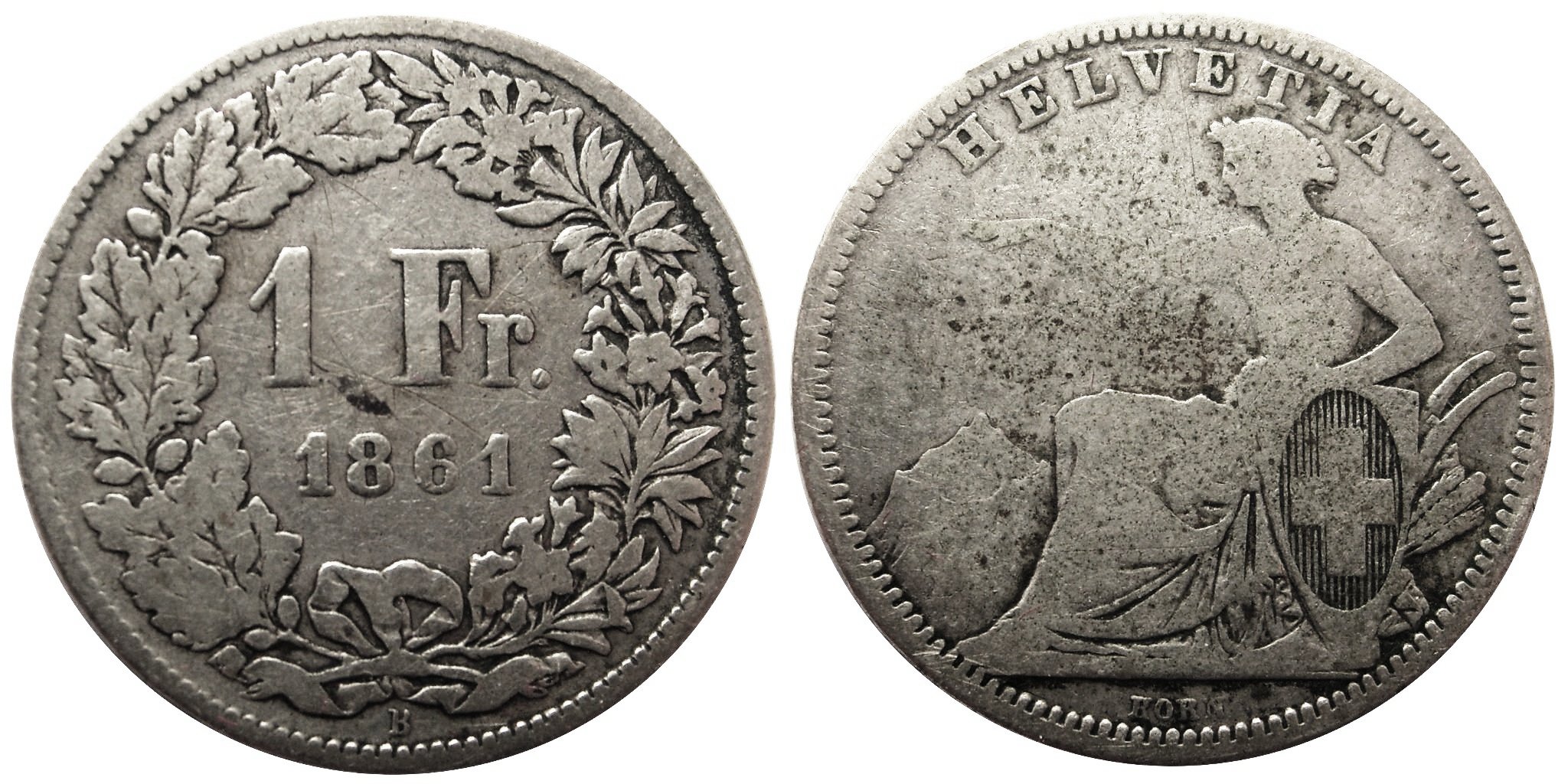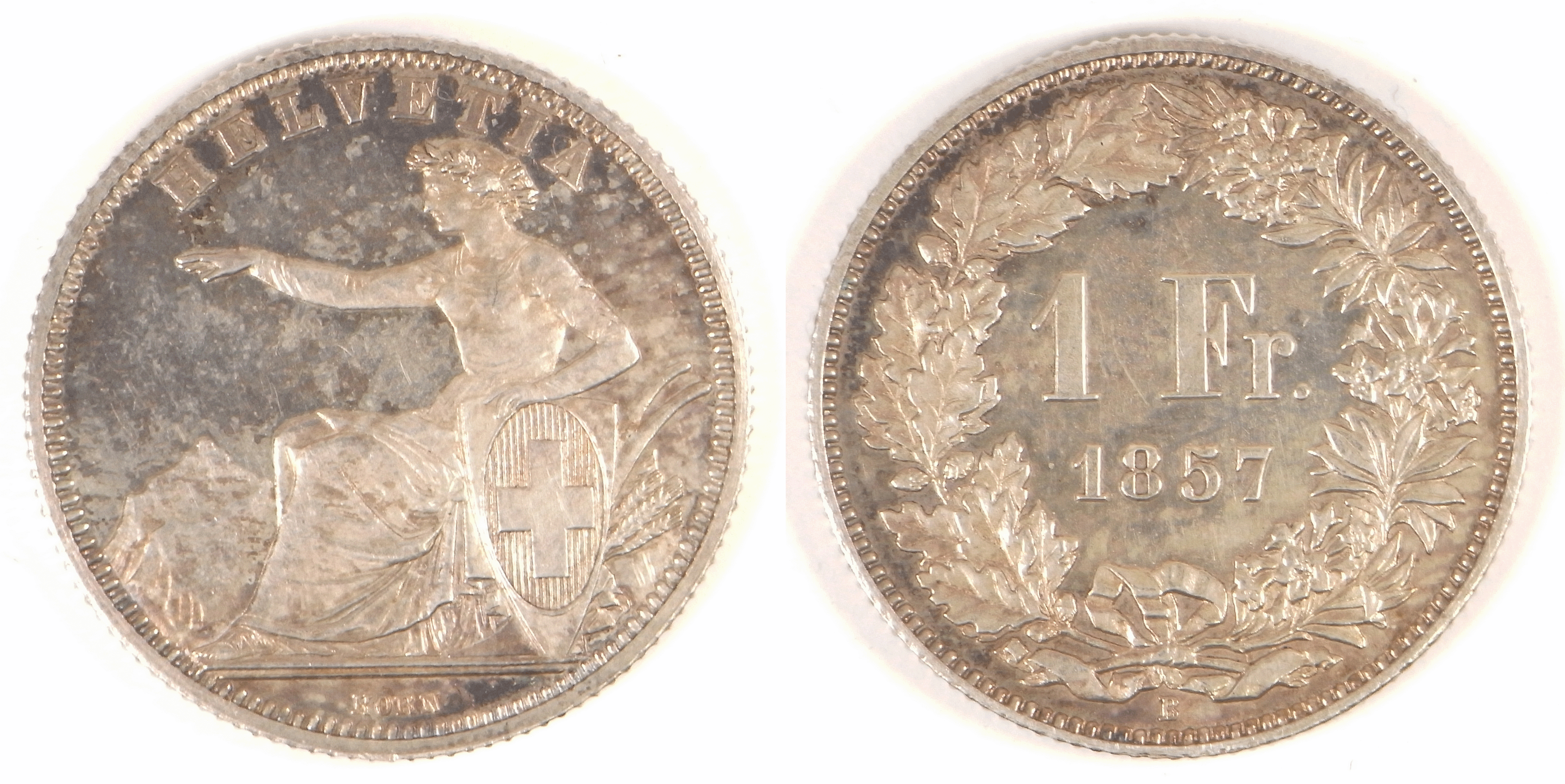 Конституция Швейцарии, принятая в 1848 году, устанавливала исключительное право федерального правительства на чеканку монеты. 7 мая 1850 года был принят федеральный закон о чеканке монет, в том же году начата чеканка швейцарских монет, в том числе монет в один франк. Модель монеты выполнил гравёр Антуан Бови (Женева) по эскизу Альберта Валха (Берн). Серебряные монеты этого типа чеканились до 1861 года, при этом в 1850—1857 годах монеты чеканились 900-й пробы, а в 1860—1861 годах — 800-й[2].