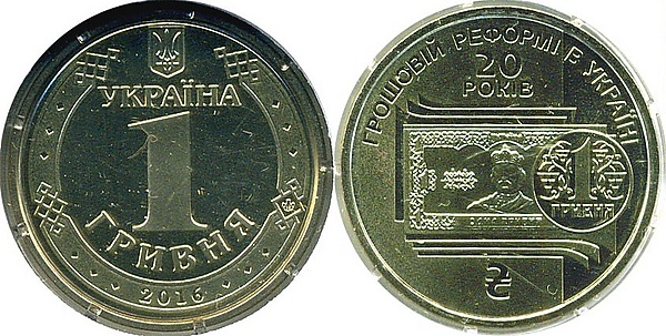 | 26 мм | 1,85 мм | 6,8 г | Надпись по кругу: «ГРОШОВІЙ РЕФОРМІ В УКРАЇНІ 20 РОКІВ», стилизированная композиция: одногривневая монета на фоне одногривневых банкнот и надписи: ГРОШОВІЙ РЕФОРМІ В УКРАЇНІ(сверху полукругом), 20/РОКІВ и знак гривны ₴ внизу | 2016 | 1 сентября 2016 | ||||||