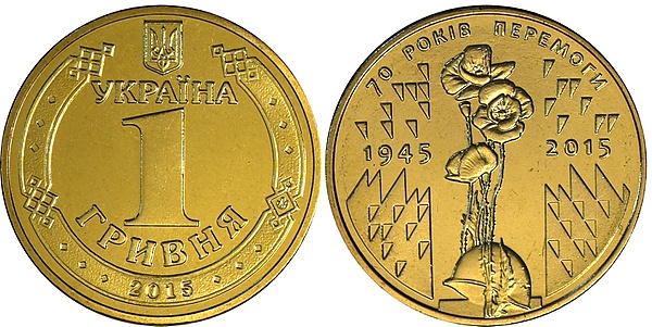 Оборотная памятная монета номиналом 1 гривна «70 лет Победы» посвящена 70-й годовщине победы в Великой Отечественной войне, участникам боевых действий 1941—1945 годов, памяти павших в борьбе с фашизмом и ветеранам трудового фронта.