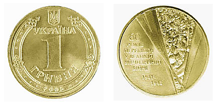 Оборотная монета номиналом 1 гривна «60 лет Победы в Великой Отечественной войне 1941—1945 годов» посвящена 60-й годовщине победы в Великой Отечественной войне, участникам боевых действий 1941—1945 годов, памяти павших в борьбе с фашизмом и ветеранам трудового фронта.