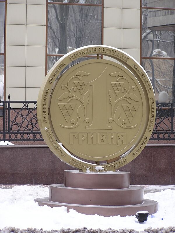 В Донецке в мае 2005 года перед центральным офисом Проминвестбанка был установлен памятник гривне в виде изображения монеты «1 гривна» образца 1995 года. Памятник выполнен из нержавеющей стали, окрашен под золото. Монета периодически вращалась вокруг вертикальной оси.[13]. Демонтирован в ноябре 2015 года.