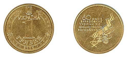 Оборотная монета номиналом 1 гривна «60 лет освобождения Украины от фашистских захватчиков» посвящена 60-й годовщине освобождения Украины от фашистских захватчиков.