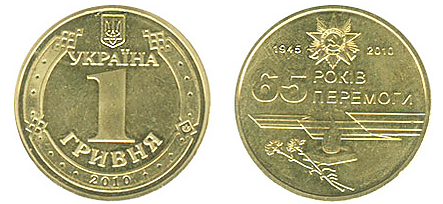 Оборотная памятная монета номиналом 1 гривна «65 лет Победы» посвящена 65-й годовщине победы в Великой Отечественной войне, участникам боевых действий 1941—1945 годов, памяти павших в борьбе с фашизмом и ветеранам трудового фронта.