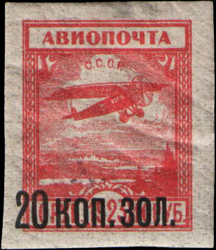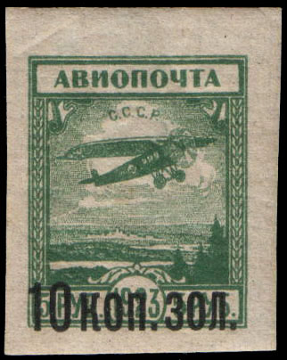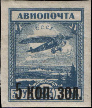 Однолетняя серия почтовых марок СССР с разными датами выпуска с чёрной типографской надпечаткой новых номиналов в денежных знаках 1923 года (в золотом исчислении) на авиапочтовых марках, не поступивших в обращение[17]. Эта серия была выпущена в 1924 году (5 мая и в декабре).
