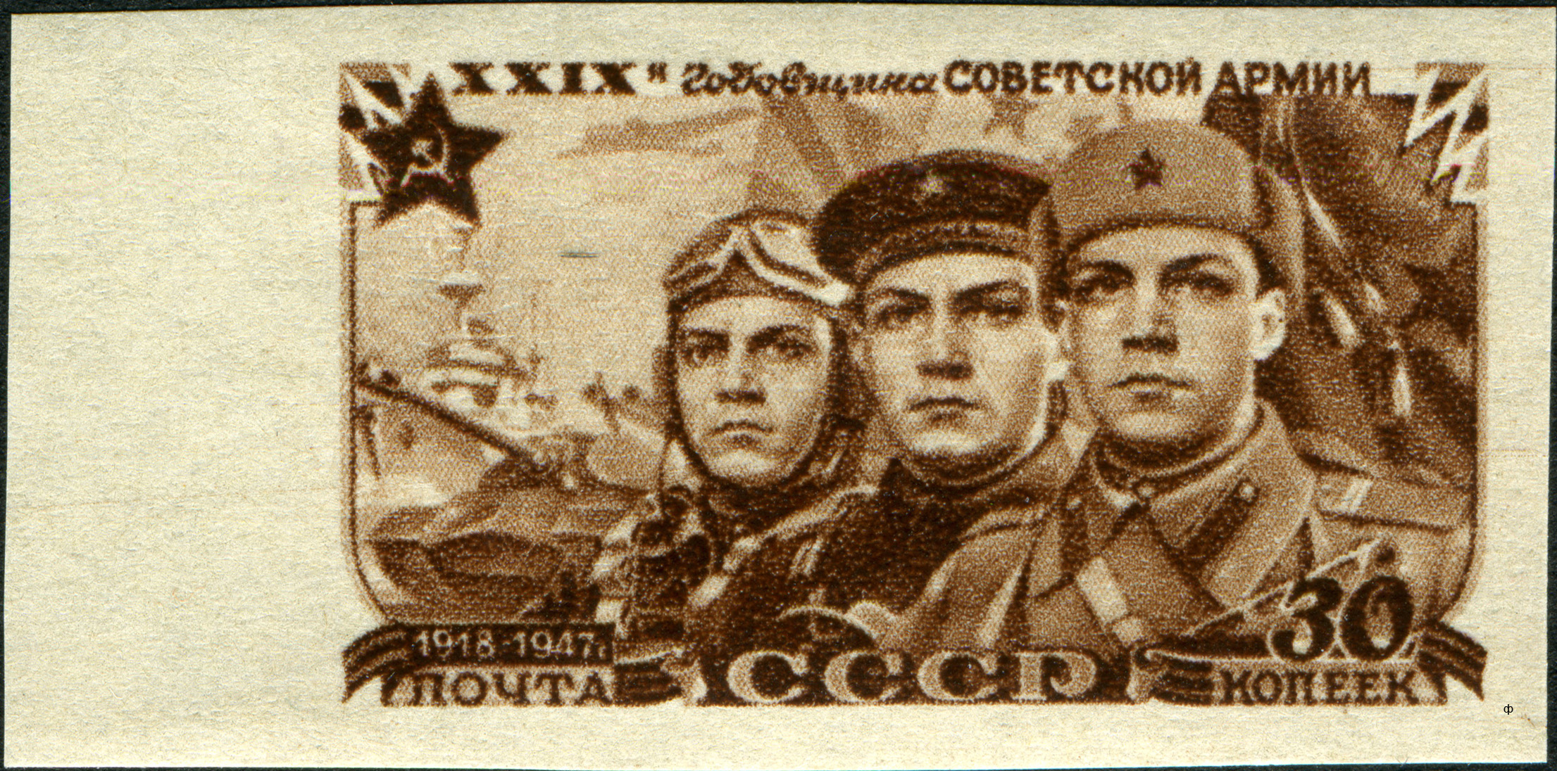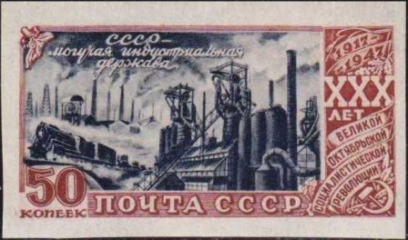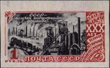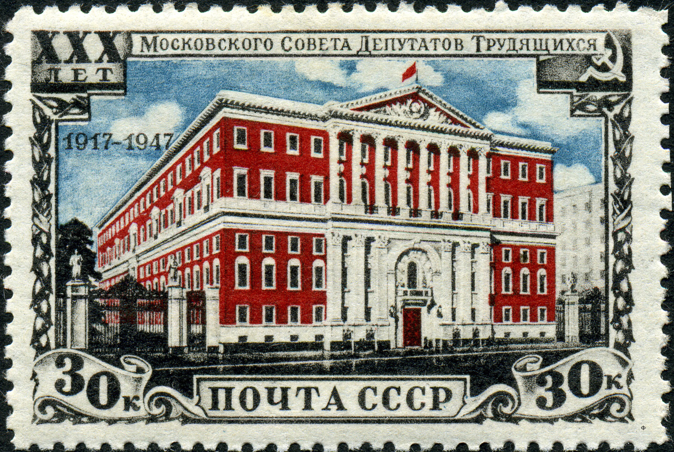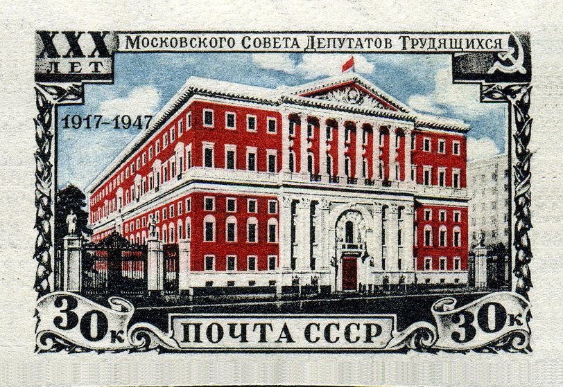 - «#30-летие Московского Совета депутатов трудящихся (1947)», содержащей марку, выпущенную с зубцами и без зубцов;