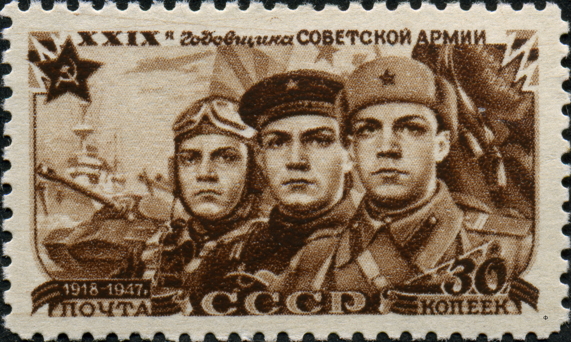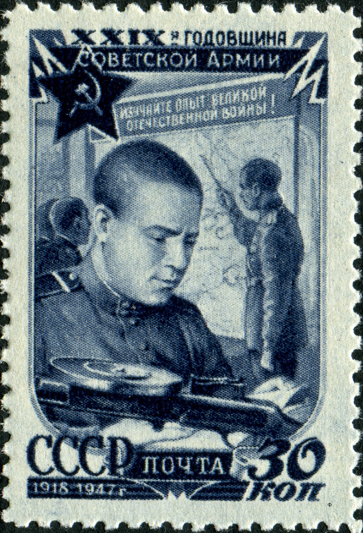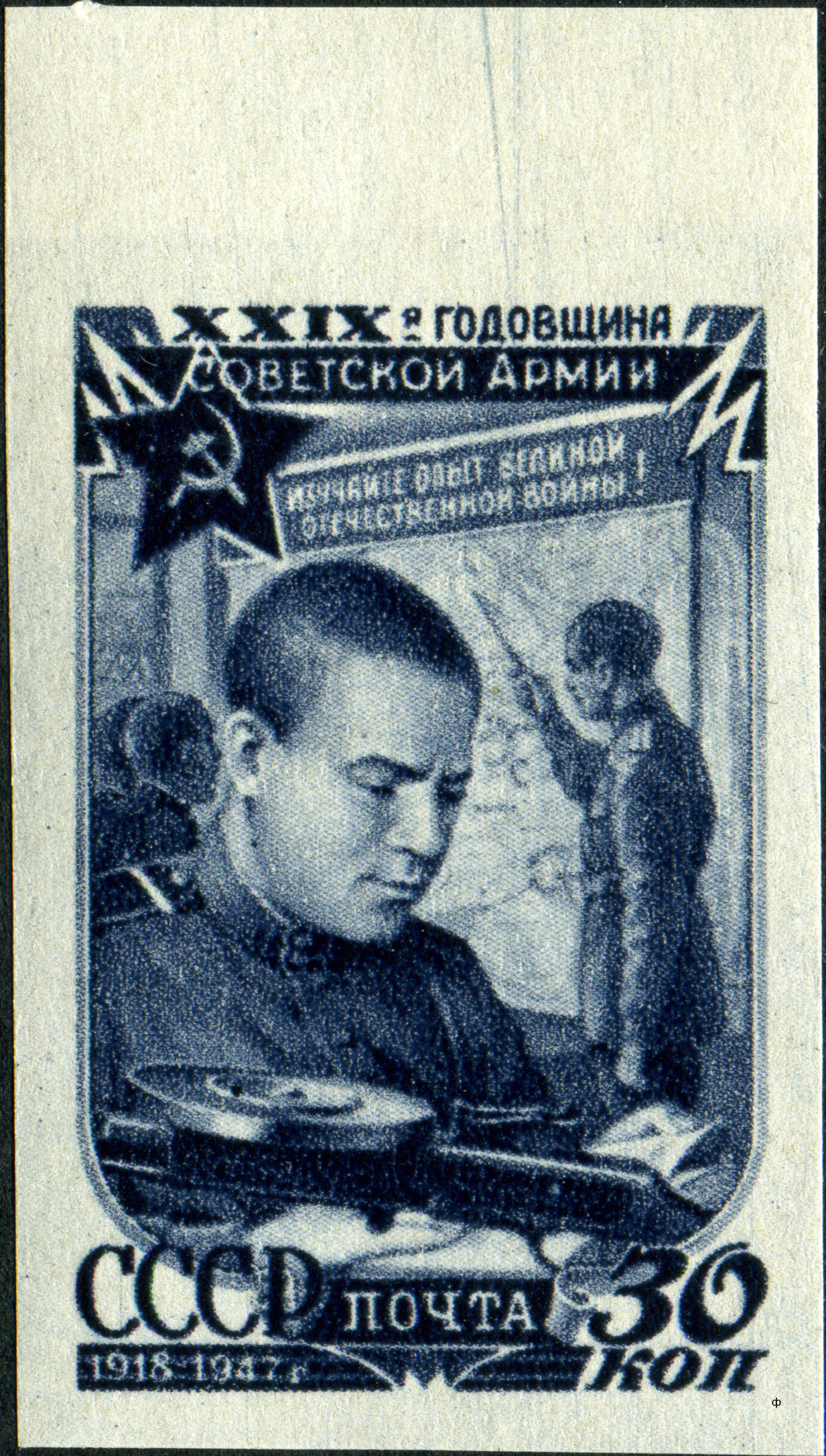 - «#30-летие Московского Совета депутатов трудящихся (1947)», содержащей марку, выпущенную с зубцами и без зубцов;