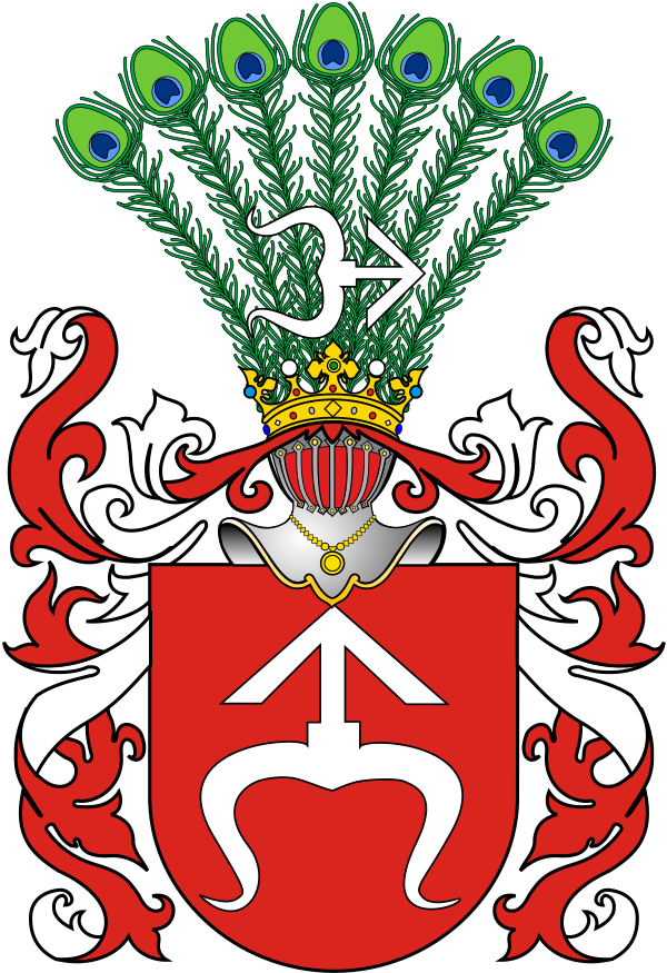 В поле червлёном стрела серебряная, вылетающая из лука с оторванной тетивой (в некоторых гербах она вылетает из подковы). Та же фигура вкось видна и на павлиньих перьях в нашлемнике. Герб этот в X веке перенесён из Моравии.