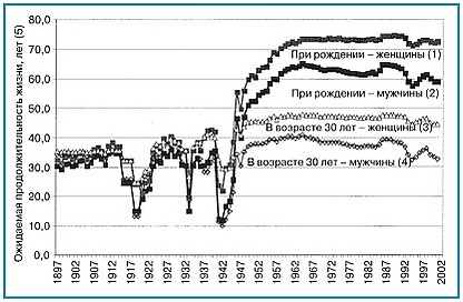 В 1950 году вероятность дожить до возраста 80—90[уточнить] лет составила в среднем 15—16 % для женщин и 12 % для мужчин.