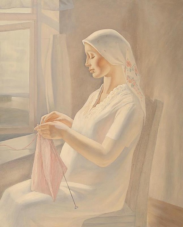На картине представлено поколенное портретное изображение молодой беременной женщины в профиль влево. Она сидит на стуле перед раскрытым окном, держа в руках светло-розовое вязание. Женщина одета в длинную белую рубашку с кружевным вырезом и повязала на голову белый платок с крупными красными цветами по краям. Фон выполнен в светло-серой цветовой гамме.