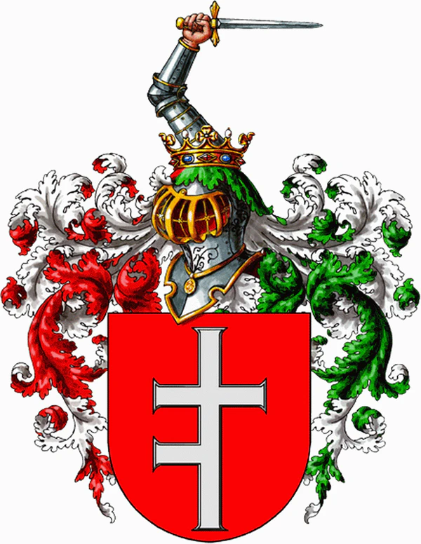 В щите имеющем красное поле изображены полтора Креста серебряные.