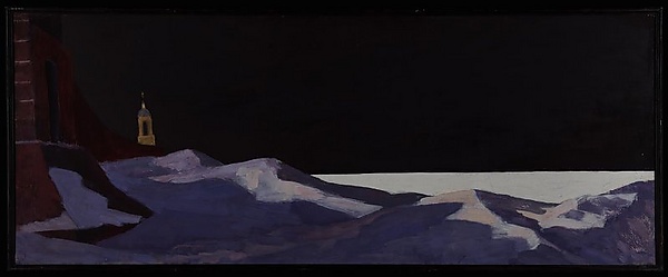 На картине представлен зимний ночной пейзаж, основную часть которого занимает плотное тёмное небо, подчёркивающее атмосферу ночи. В нижней части композиции изображены снежное поле и покрытое льдом озеро, расположенное справа. Слева на первом плане выделяется фрагмент красной кирпичной стены, а на дальнем плане виднеется жёлтая верхушка колокольни.