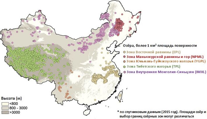 Озёра площадью поверхности более 1 км². Озёрный регион Тибетского плато (TPL) здесь охватывает также части Синьцзян-Уйгурского автономного района, провинций Юньнань и Сычуань, а зона Восточных равнин (EPL) на этой карте включает частично признанное государство Тайвань[9].