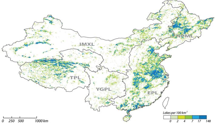 Распредение озёр по территории континентального Китая по спутниковым данным 2005—2008 годов[1]. 50 % суммарной площади поверхности озёр приходится на озёрную зону Тибетского нагорья (TPL), 25 % находится в озёрном регионе Восточной равнины (EPL), 15 % в озёрном регионе Внутренняя Монголия-Синьцзян (IMXL), 8,5 % в озерном регионе Маньчжурской равнины и гор (NPML) и 1,5 % в озерном регионе Юньнань-Гуйчжоуского нагорья (YGPL)