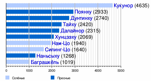 По водной переписи 2010—2012 годов, в стране насчитывалось 10 озёр с площадью поверхности от 1000 км²[5]. По опубликованным к началу 2022 года данным дистанционного зондирования Земли, таких озёр может быть ещё несколько, в таблице указаны 13. Так, площади поверхности озёр Баграшкёль, Теринам, системы озёр Мигриггъянгджам-Цо и Дорсёдонг-Цо достигают 1000 км². Систему озёр Мигриггъянгджам-Цо и Дорсёдонг-Цо часто рассматривают как единое целое[25][26][27][28]. Водоём Наньсыху, состоящий из четырёх искусственно соединённых озёр, тоже могут учитывать как озеро[29][30].