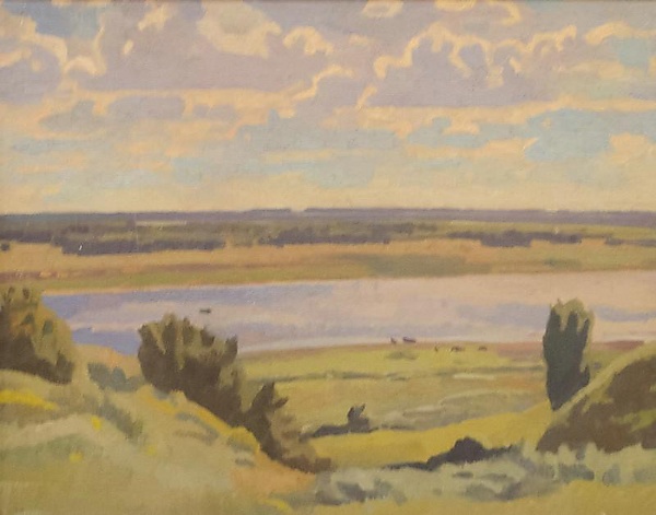 На полотне изображён летний пейзаж, в котором на переднем плане располагается зелёная холмистая местность с кустами и деревьями. Второй план занимает голубая полоса реки, протянувшаяся по горизонтали. Противоположный берег пологий и зелёный, за ним виднеется лес, уходящий к горизонту. Верхнюю часть композиции занимает высокое голубое небо с облаками, подсвеченными солнечным светом. В работе преобладают зелёные и голубые оттенки в цветовой гамме.