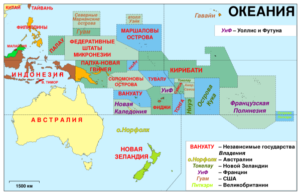 Общая площадь островов Океании, наиболее крупным из которых является Новая Гвинея, составляет 1,26 млн км², население — около 15 млн чел. (2013 год)[6]. Океания по общей площади и по общей численности населения сравнима с африканским государством Чад.