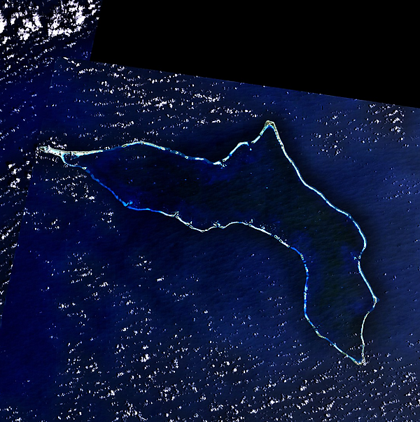 Другие же острова имеют коралловое происхождение, являясь атоллами, которые сформировались в результате образования коралловых построек вокруг погрузившихся под воду вулканов (например, острова Гилберта, Туамоту). Отличительной особенностью таких островов являются крупные лагуны, которые окружены многочисленными островками, или моту, средняя высота которых не превышает трёх метров. В Океании расположен атолл с крупнейшей лагуной в мире — Кваджалейн в архипелаге Маршалловы острова[26]. Несмотря на то, что его площадь суши составляет всего 16,32 км² (или 6,3 кв. мили), площадь лагуны — 2174 км² (или 839,3 кв. мили)[27]. Крупнейшим же атоллом по площади суши является остров Рождества (или Киритимати) в архипелаге Лайн (или Центральные Полинезийские Спорады) — 322 км²[28]. Однако среди атоллов встречается и особый тип — поднятый (или приподнятый) атолл, который представляет собой известняковое плато высотой до 50—60 м над уровнем океана. У этого типа острова лагуна отсутствует или имеются следы её прошлого существования. Примерами таких атоллов могут служить Науру, Ниуэ, Банаба.
