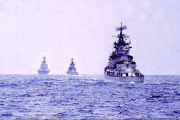 15 апреля командир «Ленинграда» М. Звездовский получил приказ следовать вместе с БПК «Отважный» в Бискайский залив, где произошла авария советской атомной подводной лодки К-8 проекта 627А. После прохождения Гибралтара командирам кораблей были даны уточнённые координаты трагедии и приказ вести поисковые работы в условиях восьмибалльного шторма[23]. Аналогичный приказ получила и группа из трёх кораблей под командованием С. С. Соколана, однако вскоре приказ был отменён — кораблям надлежало продолжать выполнение задачи по учениям. Обозначая корабли «синих», «Дзержинский», «Сообразительный» и «Комсомолец Украины» отразили атаку трёх Ту-95 «красных», произведённую противокорабельными ракетами. Попутно производился поиск подводных лодок «красных», однако результатов он не дал[24]. «Ленинграду» и «Отважному» после безуспешных поисков подводников с К-8, проводившихся в течение пяти суток, было приказано следовать в Североморск для планового ремонта с обходом Британских островов к западу. У Фарерских островов корабли попали в сильный шторм и получили лёгкие повреждения. После ликвидации повреждений они продолжили путь и в конце апреля прибыли в Североморск. В Баренцевом море провели учение с атомной подводной лодкой проекта 670, в ходе которого из-за малых глубин и лодка и корабли потеряли акустический контакт друг с другом[23].