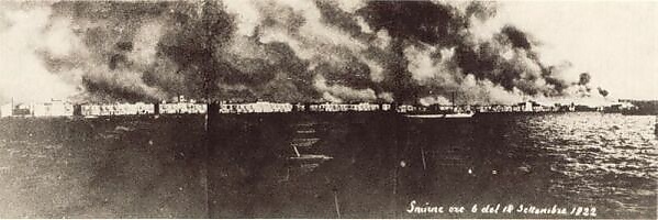 9 сентября в Смирну вступила турецкая армия Мустафы Кемаля. Согласно свидетельству американского консула Джорджа Хортона 9 сентября, когда в город вступили турки, прошло относительно спокойно: ещё утром в городе поддерживала порядок греческая жандармерия, которая передала свои функции вступившим турецким войскам. После вступления турецких войск в город 9 сентября 1922 года началась резня греческого и армянского населения. Греческие и армянские кварталы охватили пожары. Мустафа Кемаль заявлял французскому адмиралу Дюменилю: «Мы знаем, что существовал заговор. Мы даже обнаружили у женщин-армянок всё необходимое для поджога… Перед нашим прибытием в город в храмах призывали к священному долгу — поджечь город». Французская журналистка Берта Жорж-Голи, освещавшая войну в турецком лагере и прибывшая в Смирну уже после событий, писала: «Кажется достоверным, что, когда турецкие солдаты убедились в собственной беспомощности и видели, как пламя поглощает один дом за другим, их охватила безумная ярость и они разгромили армянский квартал, откуда по их словам появились первые поджигатели». Город был полностью сожжён, в пожаре погибли сотни домов, 24 церкви, 28 школ, здания банков, консульств, больницы[13][14][15][16][17]. Количество убитых в разных источниках варьируется от 60 тысяч[13] до 260 тысяч; согласно Р. Руммелю[15], средняя цифра составляет 183 тысячи греков и 12 тысяч армян[17]. По подсчётам Жиля Милтона, в резне погибли 100 000 человек, ещё 160 000 мужчин было депортировано во внутренние области Анатолии, и большинство их погибло в дороге[16].