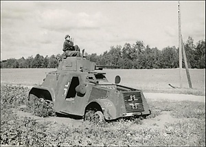 Разрушенный немецкий броневик под Хальяла. Фотография, 1942 год