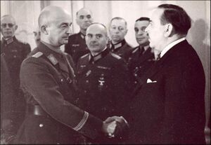 На торжественном собрании по случаю передачи власти генеральному комиссару Генерального округа Эстония Карлу Литцману (слева). Справа — руководитель Самоуправления Эстонии Хяльмар Мяэ. Фотография, 5 декабря 1941 года.