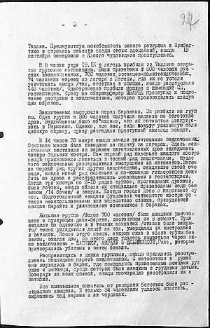 Сводка Политического управления Ленинградского фронта о зверствах немецко-фашистских оккупантов и их пособников над гражданским населением Эстонской ССР. Показания красноармейца К. Н. Килякова, бежавшего из плена, об условиях содержания в Дулаге 377 в районе города Кивиыли. Фотокопия листа 5, 3 сентября 1944 г. Государственный архив Российской Федерации