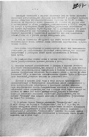 Справка о злодеяниях, совершённых немецко-фашистскими захватчиками на территории Вируского уезда Эстонской ССР. Массовое уничтожение людей в концлагерях «Эреда» и «Кивиыли». 8 октября 1944 г. Фотокопия страницы документа. Государственный архив Российской Федерации