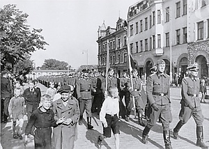 Эстонские добровольцы CC маршируют по улице Таллина. Фотография, август 1943 г. Российский государственный архив кинофотофонодокументов