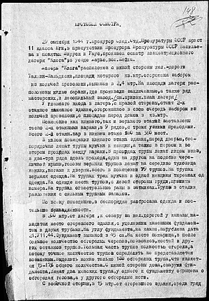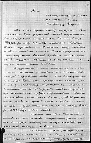 Акт о злодеяниях немецко-фашистских захватчиков в концлагере Кивиыли уезда Виру. Фотокопия листа рукописного подлинника, 7 октября 1944 г. Государственный архив Российской Федерации