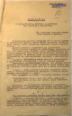 Президиум Верховного Совета СССР указом от 2 ноября 1942 года создал Чрезвычайную государственную комиссию по установлению и расследованию злодеяний немецко-фашистских захватчиков и их сообщников и причинённого ими ущерба гражданам, колхозам, общественным организациям, государственным предприятиям и учреждениям СССР[173]. Члены комиссии собрали более 250 тысяч свидетельств и составили 56 тысяч актов о преступлениях, совершённых оккупантами и их пособниками на территории СССР[174].