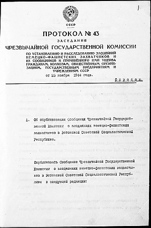 Сообщение Чрезвычайной государственной комиссии по установлению и расследованию злодеяний немецко-фашистских захватчиков и их сообщников о злодеяниях немецко-фашистских захватчиков в Эстонской Советской Социалистической Республике. — Москва: ОГИЗ : Госполитиздат, 1944.- Судебный процесс по делу о злодеяниях немецко-фашистских захватчиков на территории Латвийской, Литовской и Эстонской ССР. — Рига: Книгоиздательство и типография № 2 VAPP, 1946. — 188 с.