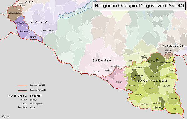 Перед войной как Бачка, так и Баранья были частями Дунайской бановины Югославии. Меджимурье входило в Хорватскую бановину, а Прекмурье было в составе Дравской бановины. После вторжения венгерские власти разделили оккупированные территории между округами (комитатами), к которым относили эти земли согласно административному делению, существовавшему до 1920 года, когда эти края принадлежали Королевству Венгрия. Такими комитатами были Бач-Бодрог, Баранья, Зала и Ваш. Чиновников на этих территориях не столько выбирали, сколько назначали. Комитаты дальше делились на районы, а власть вернула многим районам, городам и посёлкам названия, которые использовались до 1920 года, а в некоторых случаях — названия, которые не имели никакого исторического прецедента. Некоторые примеры такого переименования по каждому уезда приведены ниже[14]: