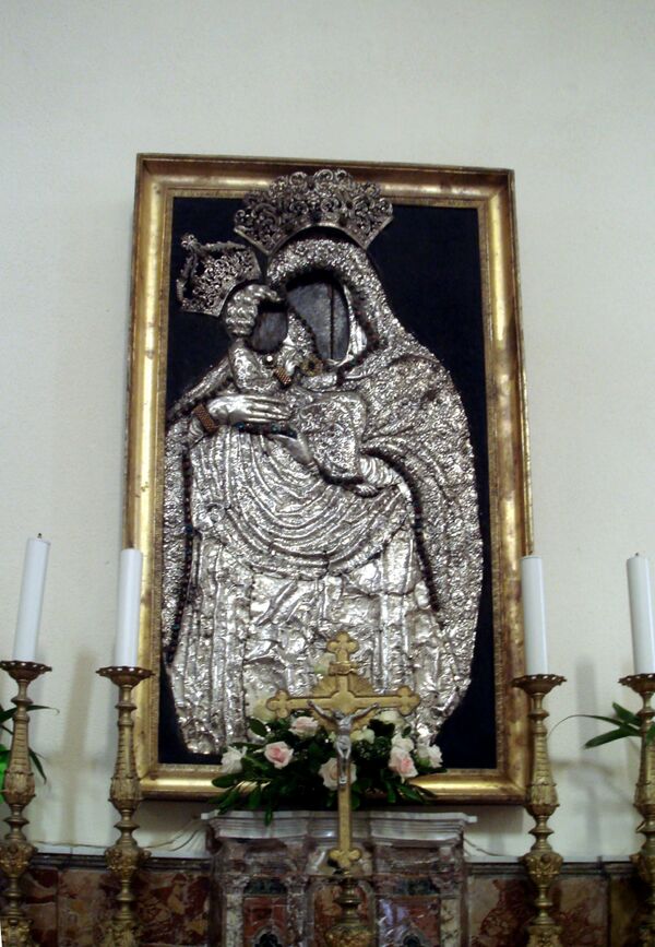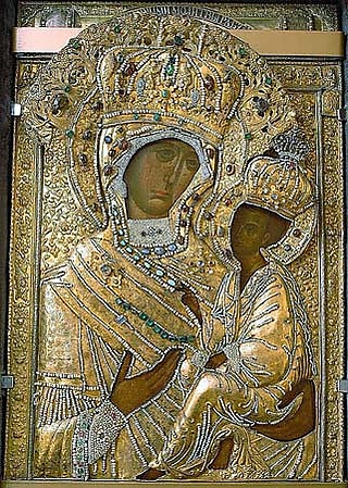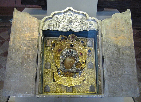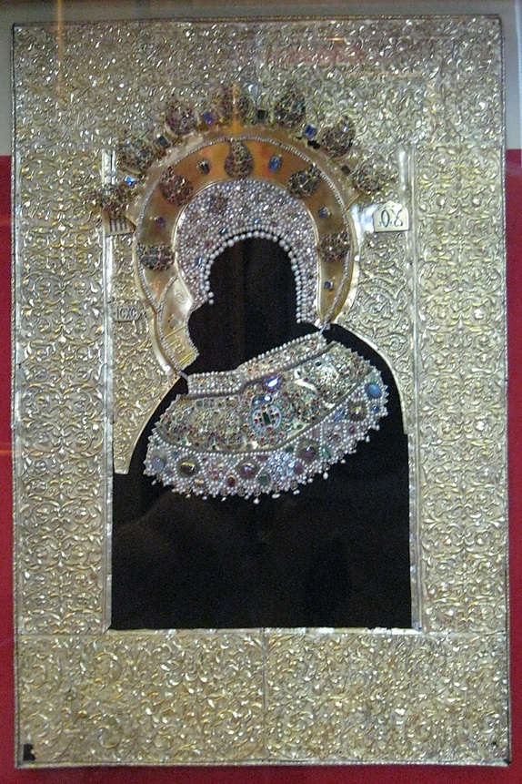 …На образах Богородицы и святых обыкновенно писаны только лики и руки, самое же платье покрыто золотой ризой. Уважаемые образа вместо риз покрыты сплошь жемчугом и драгоценными каменьями… Быть может, в одной Троицкой лавре жемчугу больше, чем во всей остальной Европе…