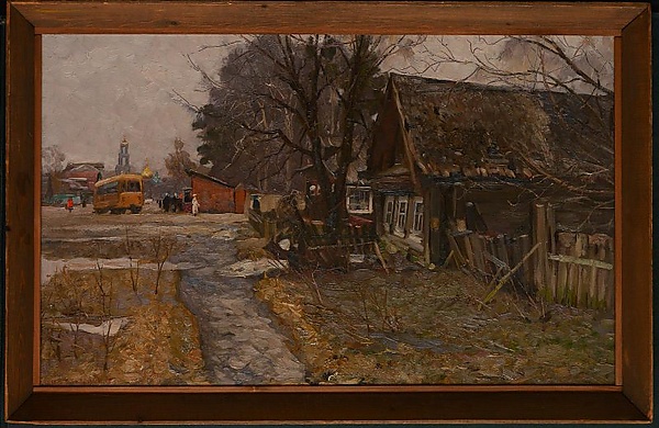 Картина представляет собой ведуту с изображением весеннего городского пейзажа улицы Кирова в Загорске. На переднем плане расположены дорожка и поляна с пожухлой травой, среди которой видны небольшие участки тающего снега. Справа изображены старые деревянные дома и деревья, подчёркивающие характер городской застройки. Средний план занимает автобусная остановка с группой людей и стоящим автобусом, что придаёт сцене жанровую насыщенность. На заднем плане выделяются силуэт колокольни Троице-Сергиевой лавры, купола Успенского собора, а также домики и деревья, формирующие панораму города.
