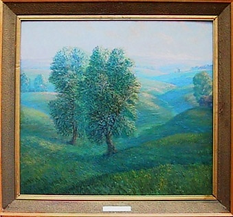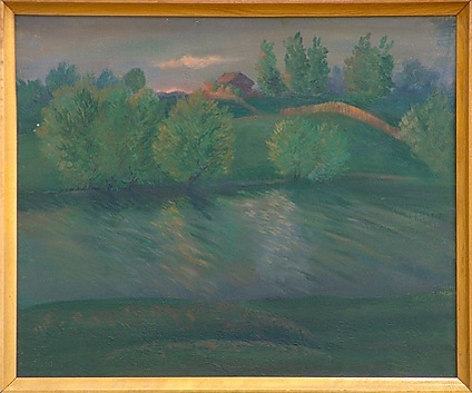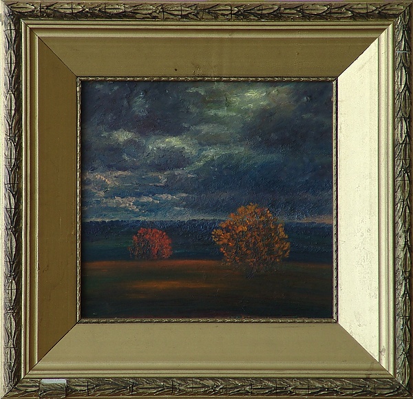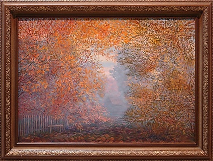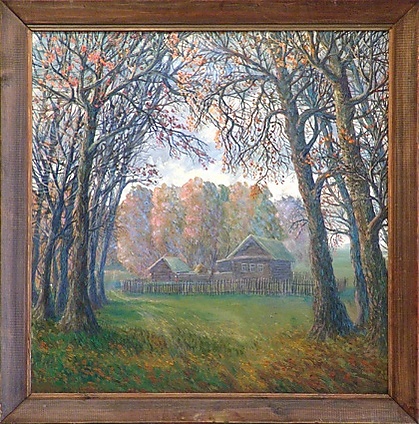 Полотно представляет собой пейзаж с изображением осенней природы. На переднем плане находится золотисто-зелёная поляна, по краям которой возвышаются высокие дубы с ажурными ветвями и мелкими золотисто-жёлтыми листьями на фоне серого неба. В глубине композиции показана деревенская усадьба с изгородью, за которой располагается густой красновато-зелёный лес. Для работы характерны сухая, графичная манера письма и преобладание холодных оттенков в цветовой гамме.
