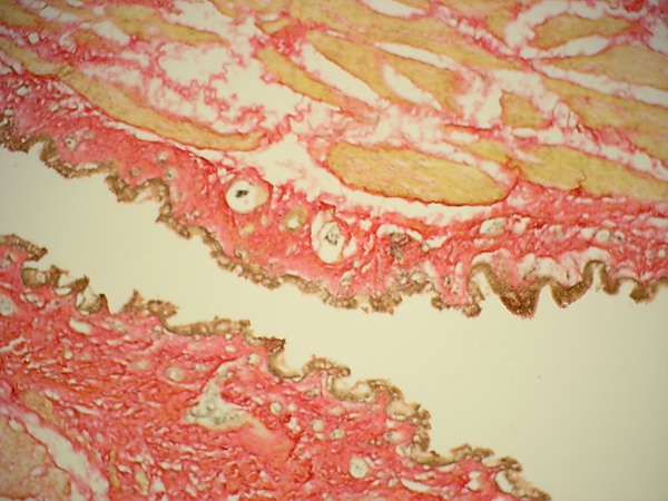 - Окраска пикрофуксином по Ван-Гизону в течение 5 минут.
