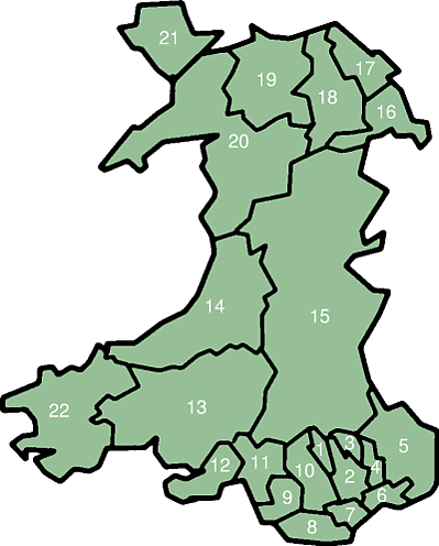 | 15 | Поуис | Powys | Powys | Лландриндод-Уэлс | 5196 | 133 000 | 25,60 | |