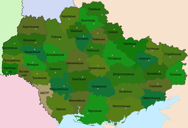 В 1923 году губернии, входившие в состав УССР, были разделены на округа (вместо уездов), которые, в свою очередь, делились на районы (вместо волостей). В 1925 году губернии на Украине были ликвидированы, и округа перешли в непосредственное подчинение республике, группируясь по экономическим зонам (Полесье, Правобережье, Степь), количество которых в 1925—1930 годах разнилось.