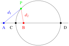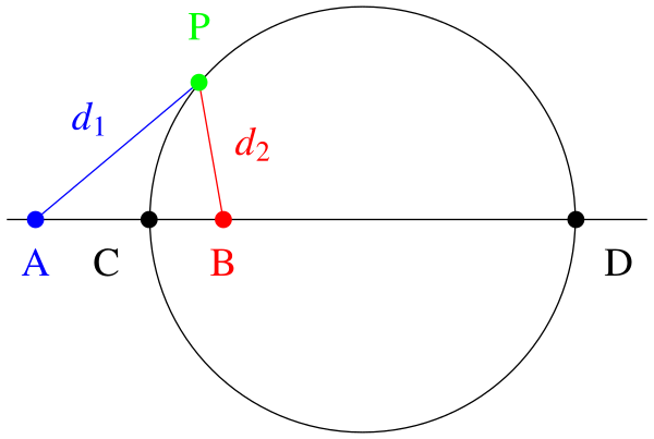 есть фиксированное положительное число. При эти точки заполняют срединный перпендикуляр к отрезку ; в остальных случаях указанное геометрическое место — окружность, называемая окружностью Аполлония.