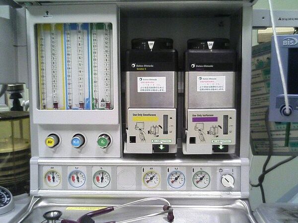 - при отёке лёгких, что сопровождается выделением пенистой жидкости из дыхательных путей, кислородную смесь барботируют через пеногаситель — увлажнение газовоздушной смеси (или кислорода) антифомсиланом[8][9][10] или 50 % раствором этилового спирта.