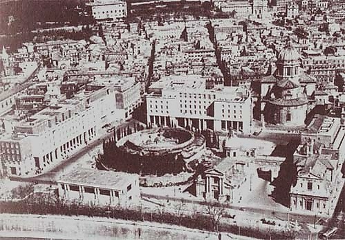 Параллели с современностью проводились и в других странах, прежде всего, в Италии в 1920-е — 30-е годы. Бенито Муссолини, часто обращавшийся к истории Римской империи в публичных выступлениях, нередко упоминал и Октавиана. В начале своего правления он часто обращался к образу Гая Юлия Цезаря — например, марш на Рим в 1922 году сравнивался с переходом через Рубикон в 49 году до н. э. В дальнейшем Муссолини всё чаще действовал по образу и подобию Октавиана — вероятно, из-за нежелания ассоциировать свою власть с кратким правлением Цезаря, закончившимся его убийством. Параллели с Августом особенно ярко проявились в масштабной градостроительной политике Муссолини в Риме и в покровительстве археологическим раскопкам и восстановлению зданий, построенных в том числе и Августом[23]. Впрочем, в публичных выступлениях дуче продолжал часто обращаться к образу Гая Юлия Цезаря[24]. В 1924 году началась реставрация Форума Августа, а к 2000-летию Октавиана в северной части Марсова поля была заложена площадь императора Августа (итал. Piazza[le] Augusto Imperatore). Проект площади, включавшей отреставрированные мавзолей Августа и алтарь мира, а также несколько новых зданий по периметру, разработал известный архитектор Витторио Баллио Морпурго. Хаотичную средневековую застройку на месте будущей площади снесли, хотя оставили три храма. Их сохранение должно было символизировать сосуществование в едином пространстве августовского Рима, папского Рима и нового Рима Муссолини. Мавзолей Августа, который в Средние века использовали как источник строительных материалов, а затем переделали в концертный зал, отреставрировали под руководством Антонио Муньоса. Алтарь мира пострадал ещё сильнее: его барельефы оказались во множестве частных коллекций, а над остатками находился кинотеатр «Олимпия». В результате, алтарь мира был перенесён на новое место, а вокруг него была возведена оболочка для обеспечения сохранности. Баллио Морпурго постарался тщательно вписать внешнюю оболочку алтаря мира и другие новые сооружения в ансамбль площади. В целом, площадь была закончена к 1941, хотя реставрация мавзолея завершилась к 2000-летию Октавиана. Возле мавзолея установили бронзовую табличку с текстом «Деяний божественного Августа», которая изначально находилась там. При этом поблизости была установлена и другая табличка — с описанием деяний самого Муссолини, выполненным в схожем духе[25]. Подражание дуче Августу проявилось не только в строительстве. Как и Октавиан, Муссолини восстанавливал в Риме прежние обелиски и устанавливал новые, вывезенные из завоёванной Эфиопии (между этой победой и завоеваниями Августа проводились параллели)[26].