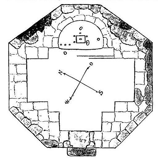 Строение в плане представляет собой немного вытянутый по продольной оси восьмигранник размерами 8,0 на 8,50 м[2] (либо 8,02 на 8,46 м, длина всех граней различна[3]) с дверями в западной стене, шириной