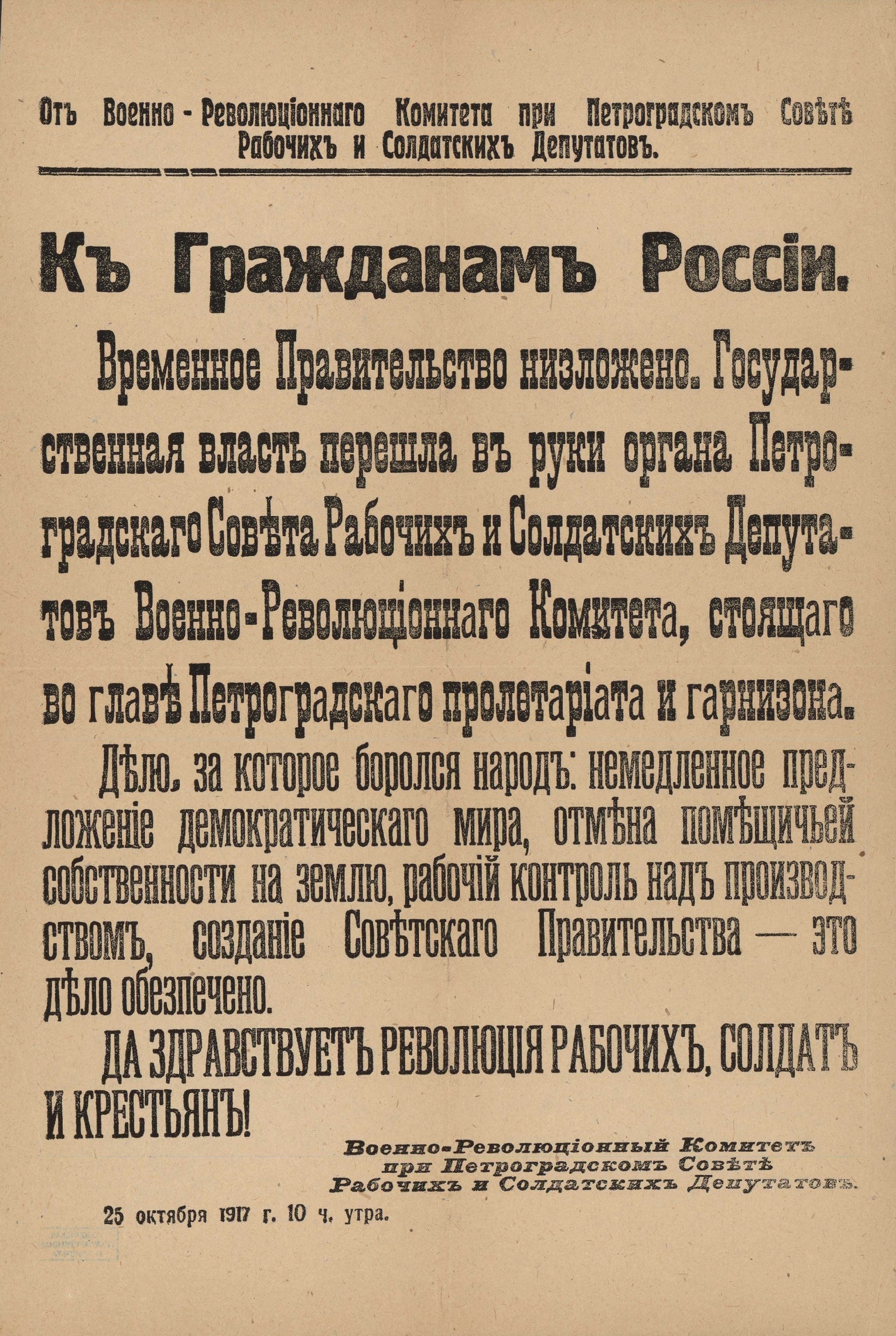 Большевики и их союзники с самого начала называли события Октября «революцией». В частности, 25 октября (7 ноября) 1917 года на заседании Петроградского Cовета рабочих и солдатских депутатов В. И. Ленин начал доклад с фразы: «Товарищи! Рабочая и крестьянская революция, о необходимости которой всё время говорили большевики, свершилась!»[47].